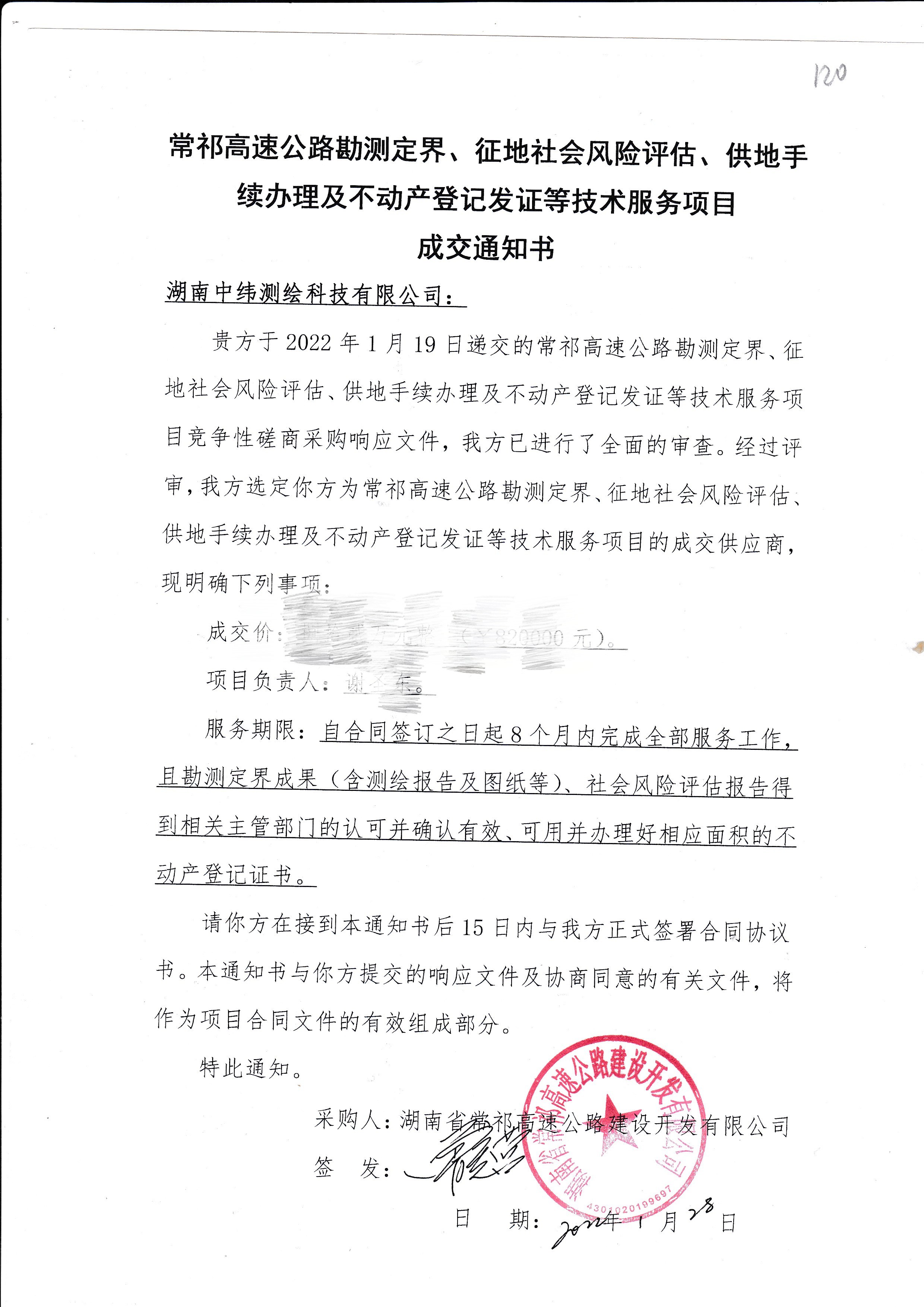 2022年1月19日,我司參加了湖南省常祁高速公路建設(shè)開發(fā)有限公司組織的“常祁高速公路勘測定界、征地社會(huì)風(fēng)險(xiǎn)評估、供地手續(xù)辦理及不動(dòng)產(chǎn)登記發(fā)證等技術(shù)服務(wù)項(xiàng)目”競標(biāo)活動(dòng),經(jīng)湖南省常祁高速公路建設(shè)開發(fā)有限公司的全面審查、綜合評定,我司脫穎而出,成功中標(biāo)。